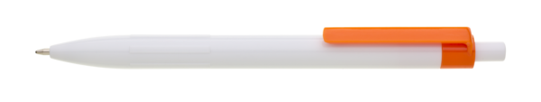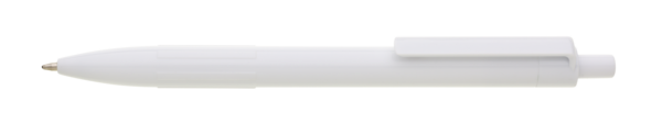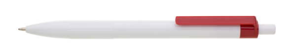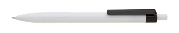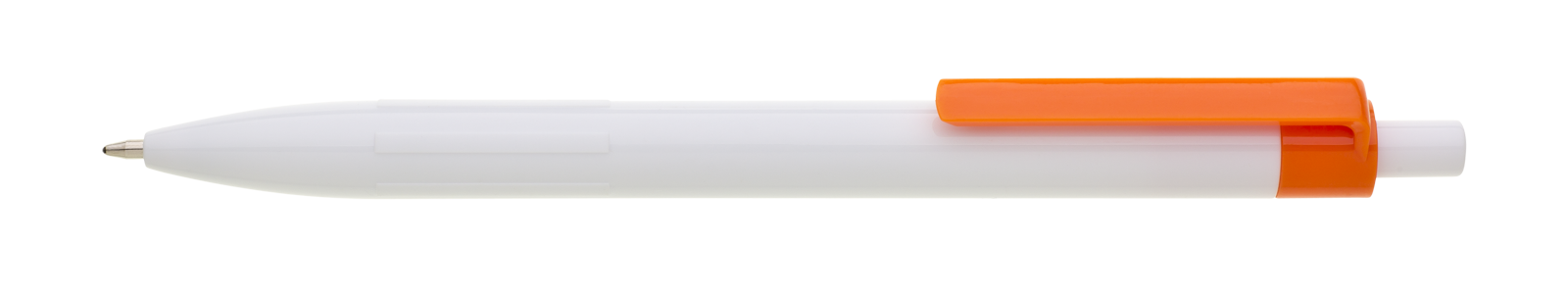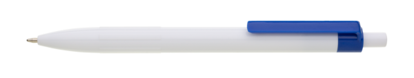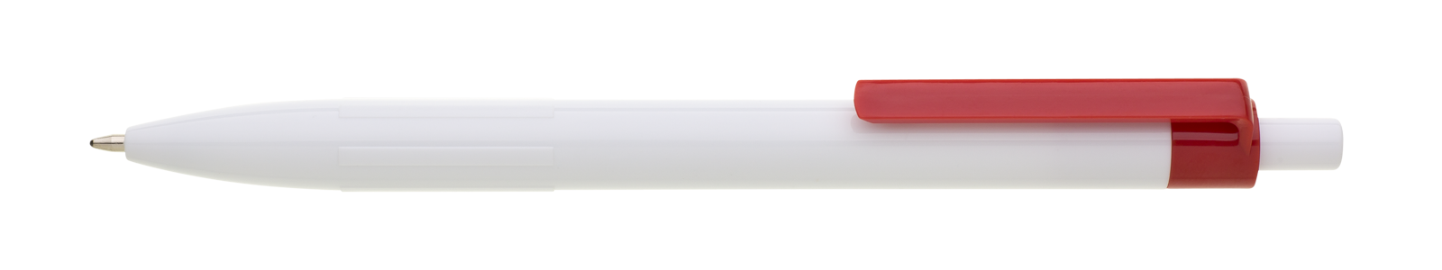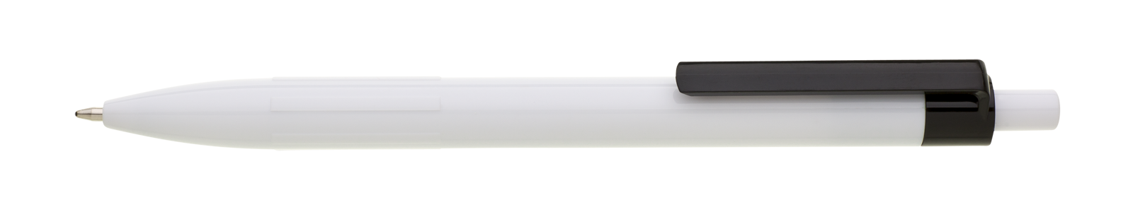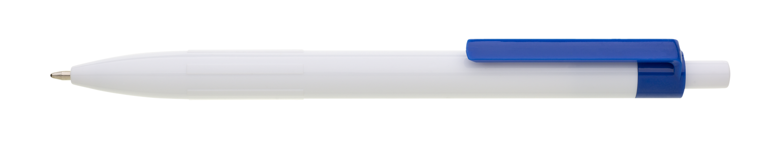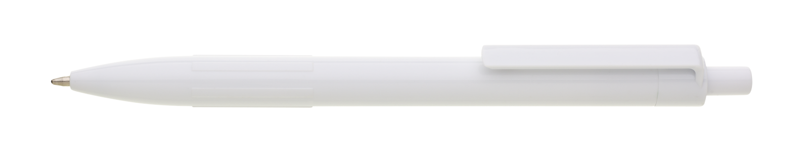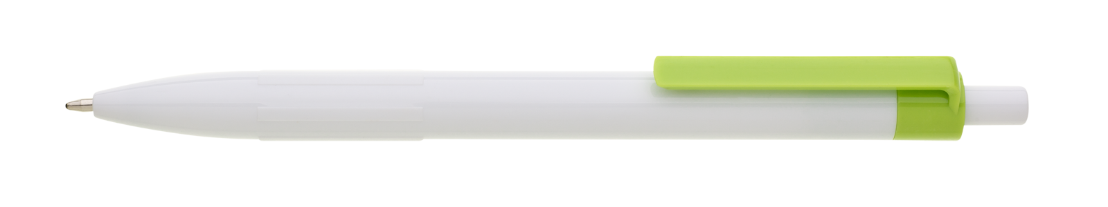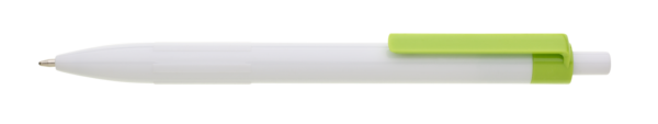 Plastové guľôčkové pero BIARE má biele telo a zelený klip. Náplň X-20 (120 mm), modro píšúca.