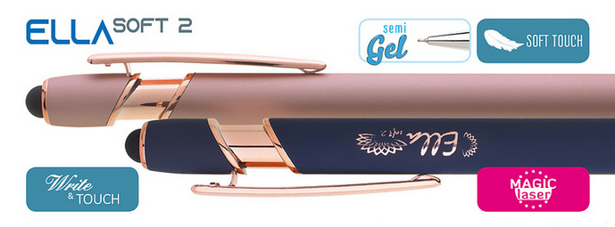 Kovové dotykové guľôčkové pero ELLA SOFT 2 so soft povrchom a doplnkami vo farbe rose gold. Vďaka špeciálnemu povrchu logo po gravírovaní bude taktiež v striebornej farbe (magic laser). Modrá náplň- semigel s mikrohrotom.