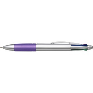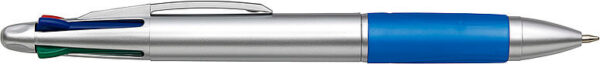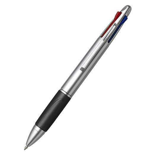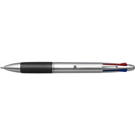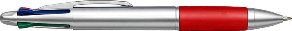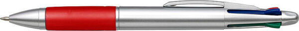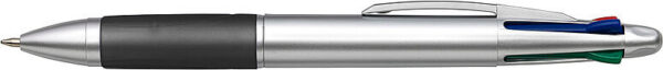 Plastové guľôčkové pero so štyrmi farbami písania, červená, modrá, zelená a čierna, strieborná hlaveň a gumová rukoväť.