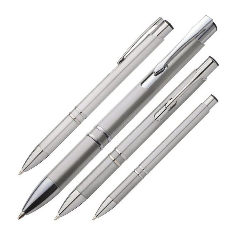 Plastové guľôčkové pero s modrou plastovou náplňou a striebornými prvkami.