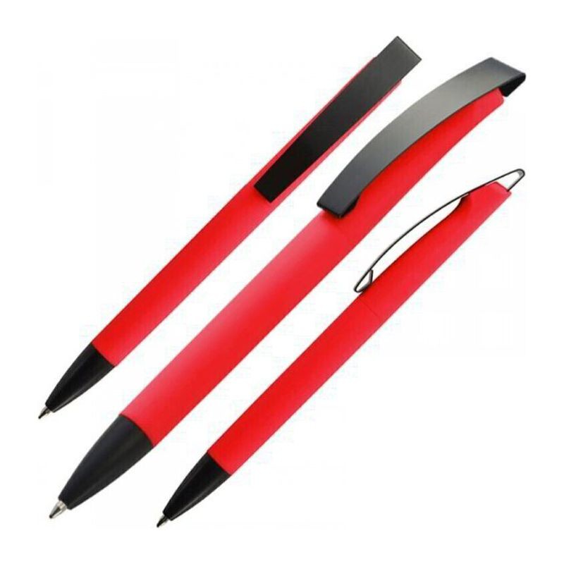 Plastové guľôčkové pero s modrou náplňou a pogumovaným povrchom.
