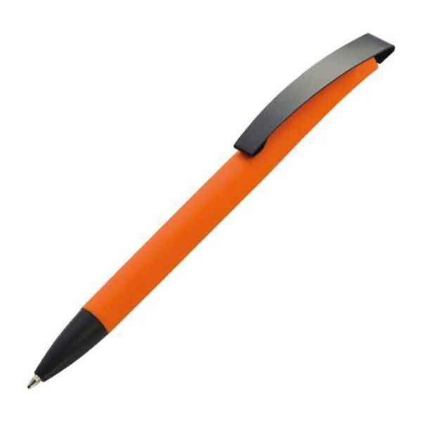Plastové guľôčkové pero s modrou náplňou a pogumovaným povrchom.