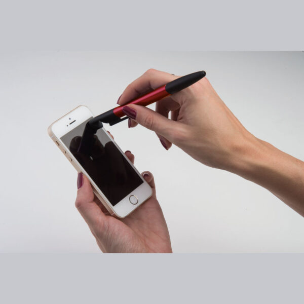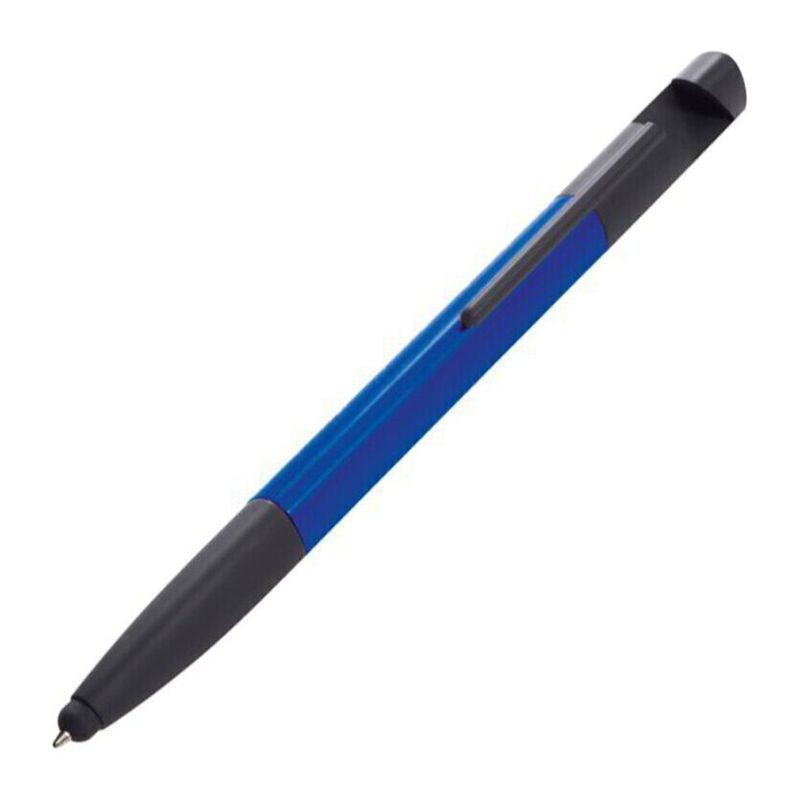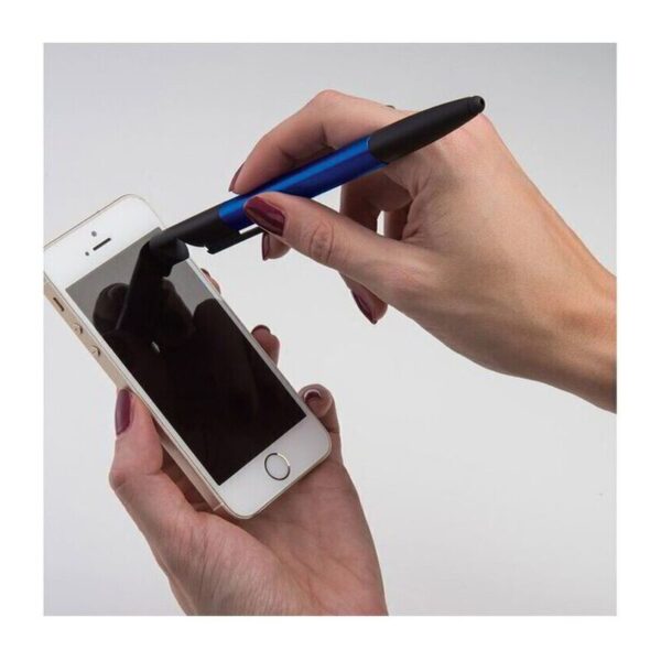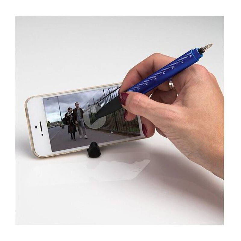 Plastové guľôčkové pero 6v1, s modrou náplňou, dotykovou funkciou, pravítkom, držiakom na mobil, leštičkou displeja a skrutkovačom.