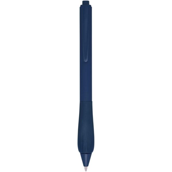 Guľôčkové pero z recyklovaného plastu s pogumovaným telom a rukoväťou z TPR. Farba atramentu: Modrá. Dĺžka písania: 1000 metrov. Rozmer hrotu: 1,0 mm.