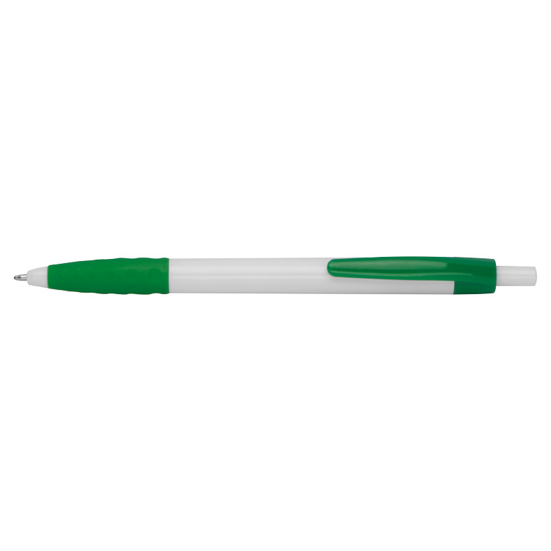 Plastové guľôčkové pero s modrou náplňou na písanie. Biele telo, farebný klip a farebná časť na uchopenie.
