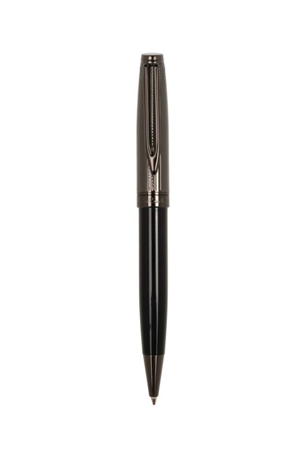 Luxusné kovové guľôčkové pero značky Pierre Cardin v elegantnom dizajne. Telo pera je navrhnuté v lesklej čiernej farbe a štruktúrovaná horná časť vo farbe gunmetal. Guľôčkové pero má otočný mechanizmus a obsahuje kvalitnú modrú náplň s hrotom 1 mm. Dodávané s náhradnou čiernou náplňou. Balené v luxusnej krabičke, dodávané s certifikátom pravosti. Rozmery: guličkové pero 1,4 x 13,9 cm; balenie 18,5 × 3, 1 × 7,5 cm.
