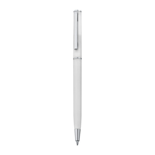 Guľôčkové pero z plastu s modrou náplňou. Toto guľôčkové pero vďaka svojmu štíhlemu tvaru dokonale hodí do slučiek poznámkových blokov. Vaše logo umiestníme pri klipe tampónovou potlačou.