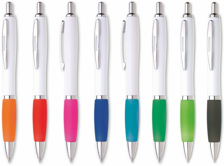 Plastové guľôčkové pero JESI bielej farby.Farebný gumový úchop, strieborné doplnky. Modrá náplň veľkoobjemová. Kolekcia EVERGREEN. Velkoobsahová