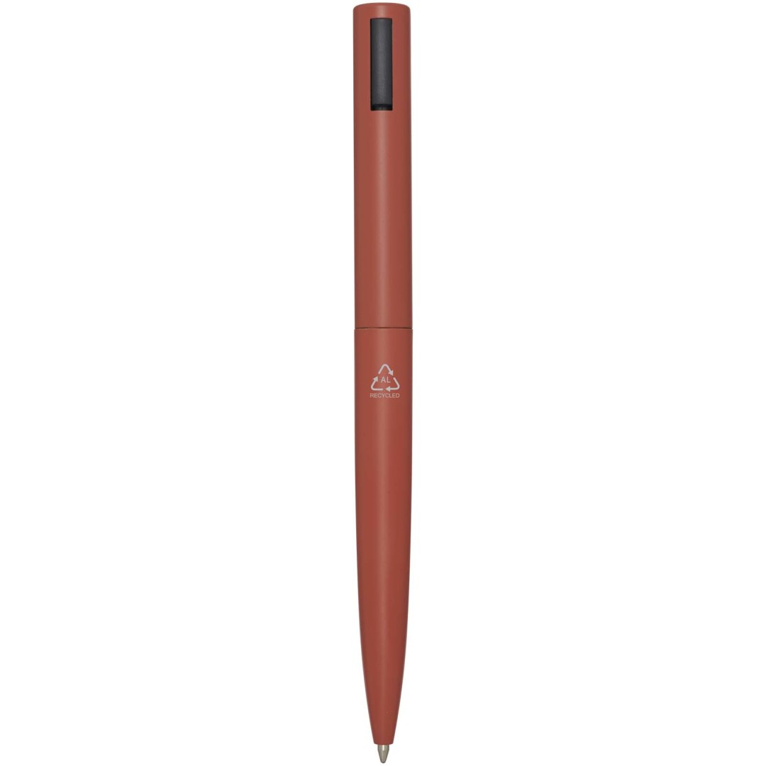 Guľôčkové pero s hornou časťou tela vyrobenou z recyklovaného plastu a spodnou časťou z recyklovaného hliníka. Spona je vyrobená zo železa. Farba atramentu: Modrá. Dĺžka písania: 1000 metrov. Rozmer hrotu: 1,0 mm.