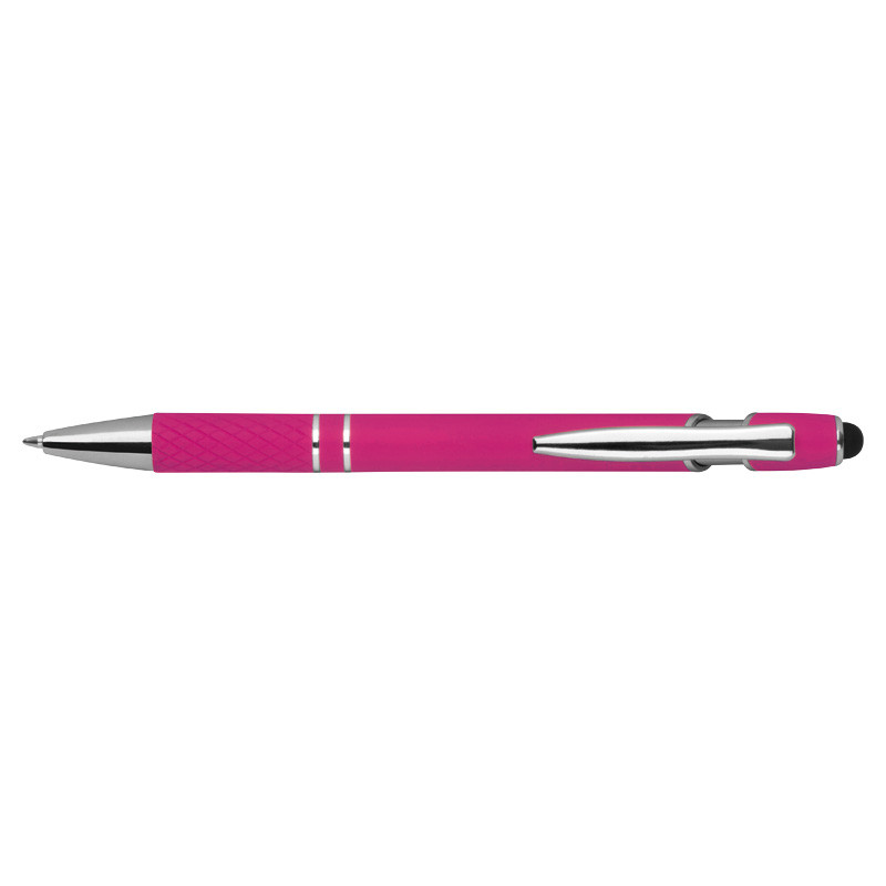 Kovové guľôčkové pero s pogumovaným povrchom, striebornými aplikáciami, dotykovou funkciou ,vzorovanou úchopovou zónou a modrou náplňou. .