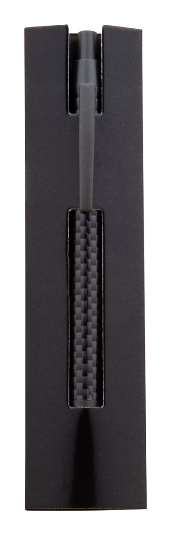 Kovové guľočkové pero s karbonovým vzorem na těle, v černém papírovém pouzdře, s modrou náplní.