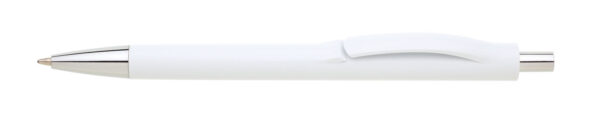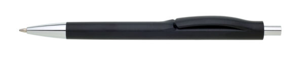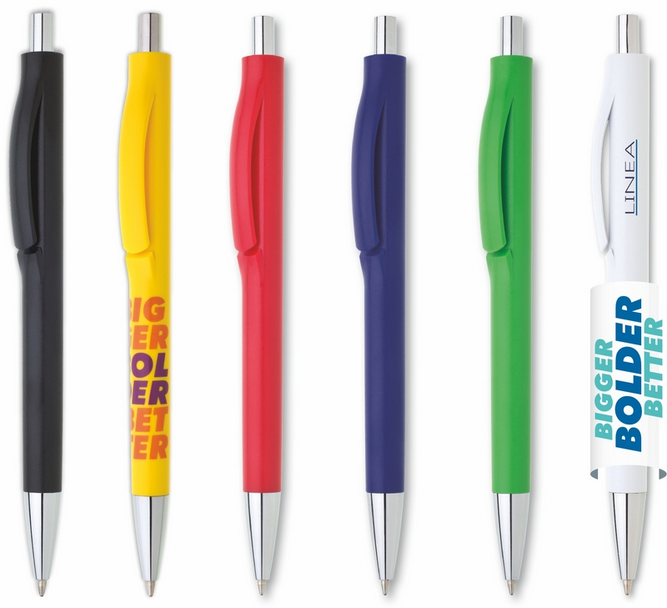 Plastové guľôčkové pero LINEA má zaujímavo tvarovaný klip a strieborné doplnky. Modrá náplň. Kolekcia DESIGN. Velkoobsahová