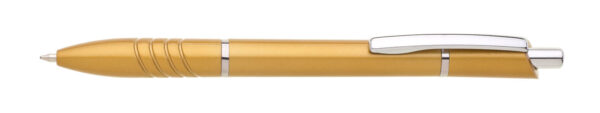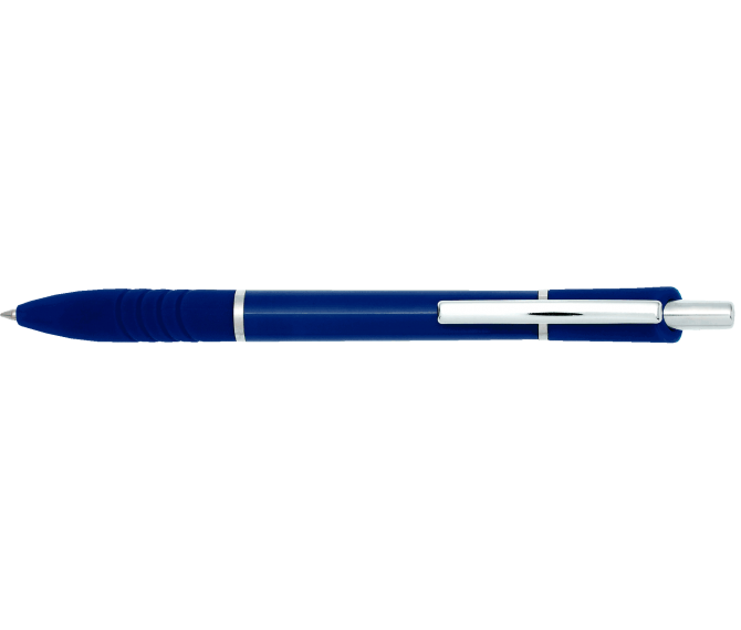Plastové pero MIRA s pochrómovanými doplnkami a ergonomicky tvarovaným úchopom. Modrá velkoobsahová náplň.
