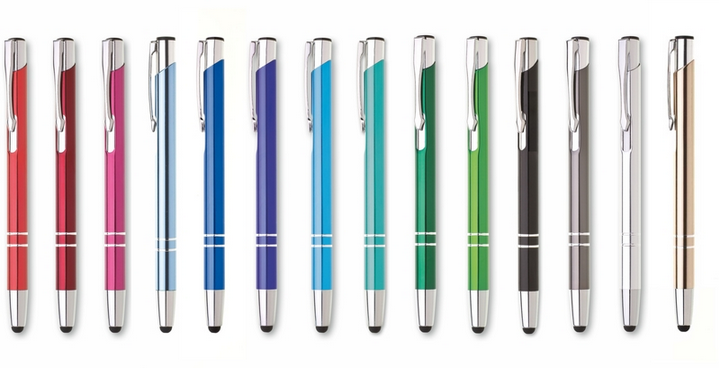 Obľúbené kovové guľôčkové pero ORIN s mäkkým hrotom pre dotykové displeje . Lesklé farebné telo je doplnené o chrómované časti. Modrá náplň veľkoobjemová. Velkoobsahová
