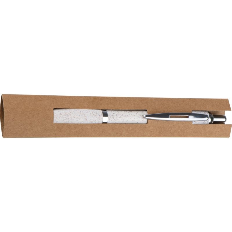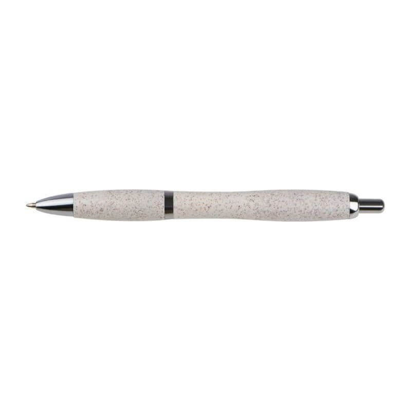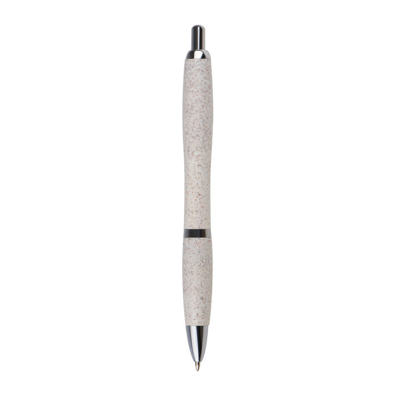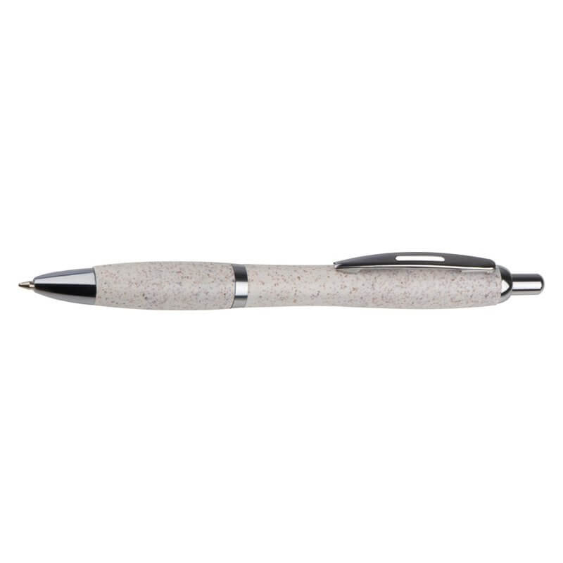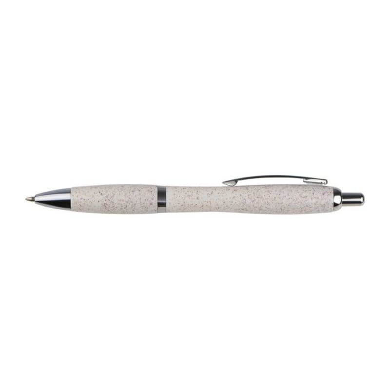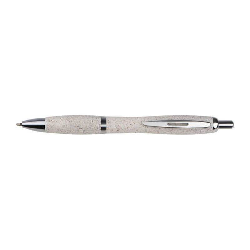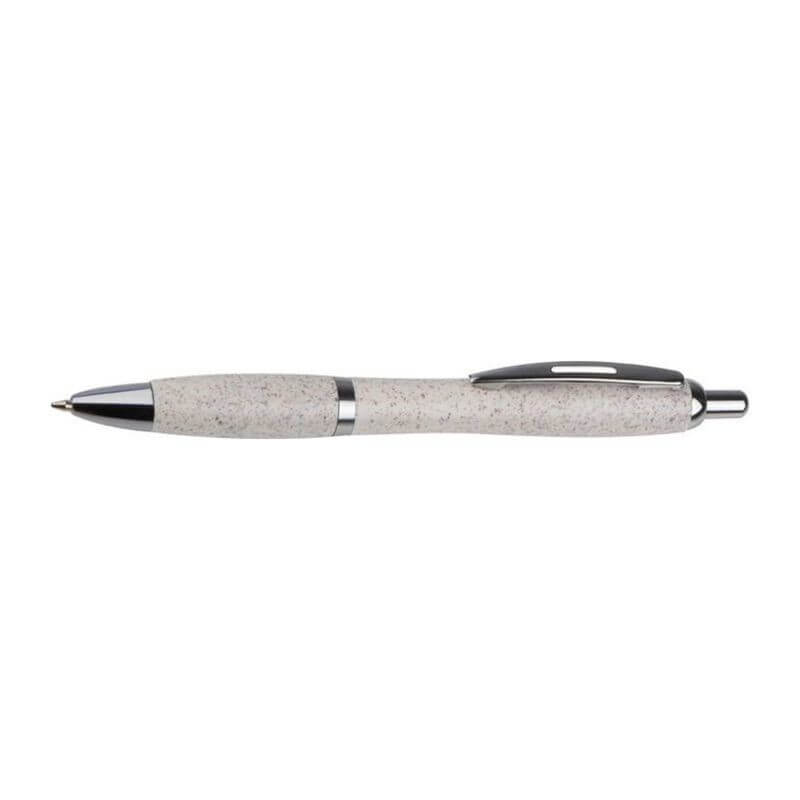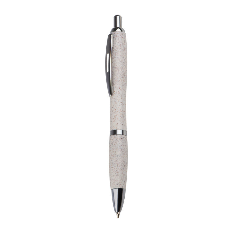 Klasické plastové guľôčkové pero s povrchom zo slamy, striebornými aplikáciami a modrou tuhou.