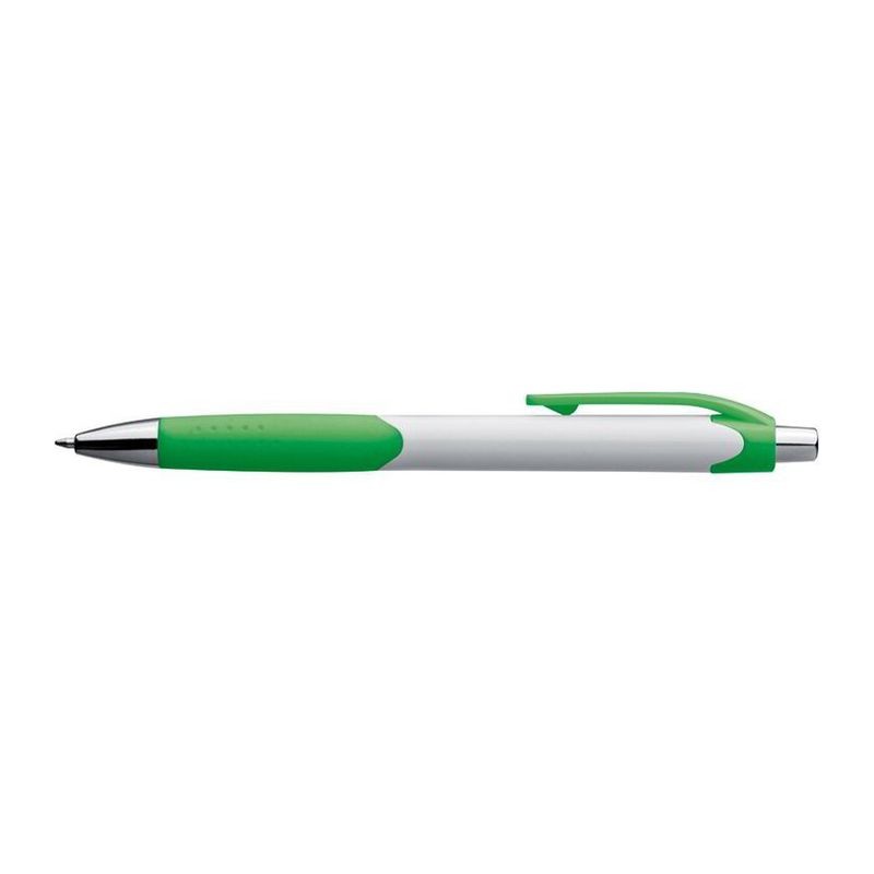 Biele plastové guľôčkové pero s farebným pogumovaním a klipom, modrou náplňou.