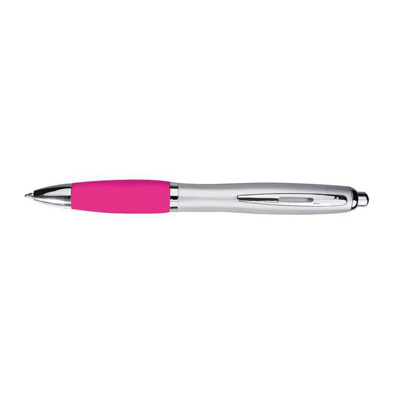 Plastové guľôčkové pero s matným strieborným telom a farebnou gumovou rukoväťou. Pero obsahuje veľkú modrú náplň.