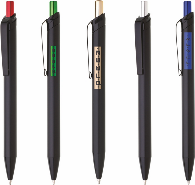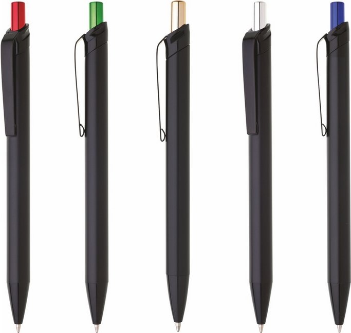 Čierne kovové pero PRESA má metalicky farebné zapínanie a výsledný efekt laseru je tiež v rovnakej farbe. Modrá náplň veľkoobjemová. Kolekcia DESIGN. Velkoobsahová