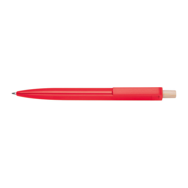 Guľôčkové pero vyrobené z recyklovaného ABS s tlačidlom z bambusu. Obsahuje modrú plastovú náplň.