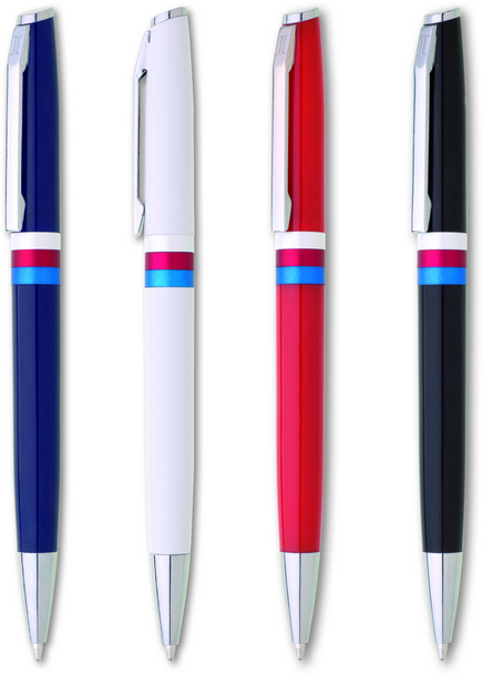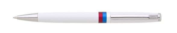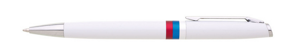Biele guľôčkové pero REPUBLICA SK s otočným mechanizmom. Na tele je znak SR a trikolóra. Modrá náplň X-20. Velkoobsahová