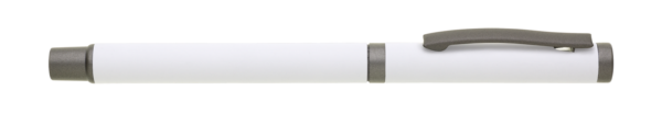 Elegantný kovový roller RIFLO SOFT s tmavosivými doplnkami a pogumovaným povrchom. S keramickou náplňou, ktorá píše modrou farbou. Keramická
