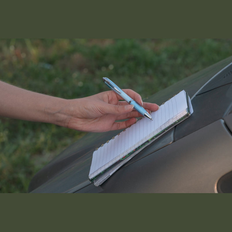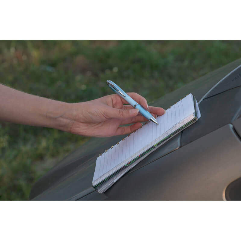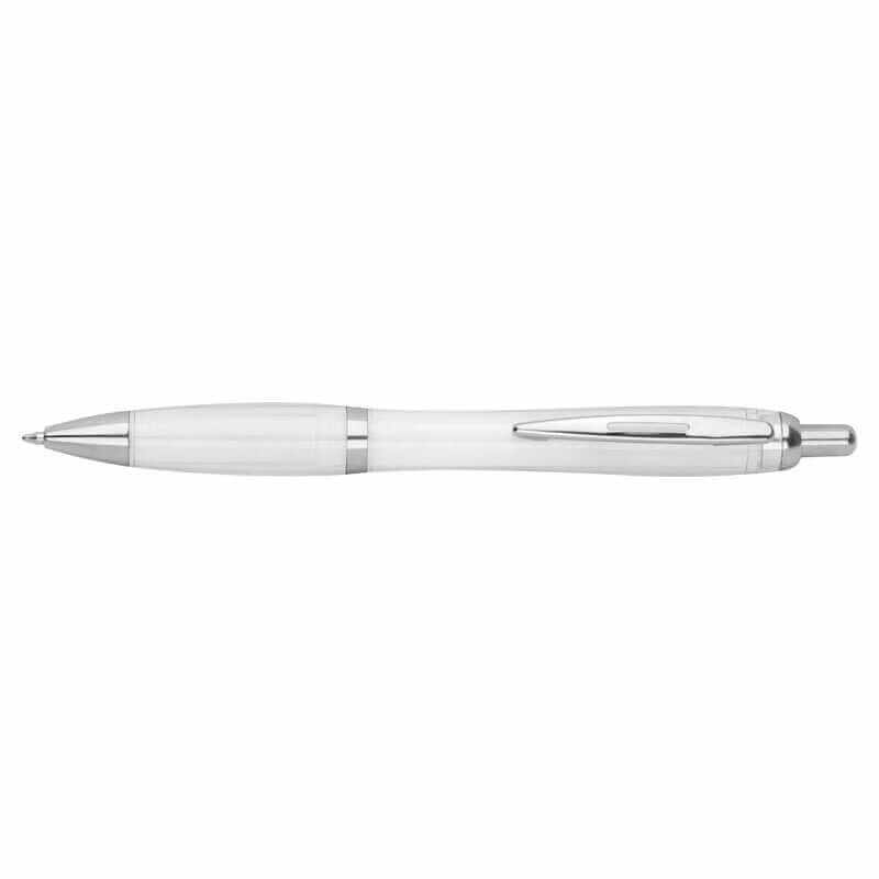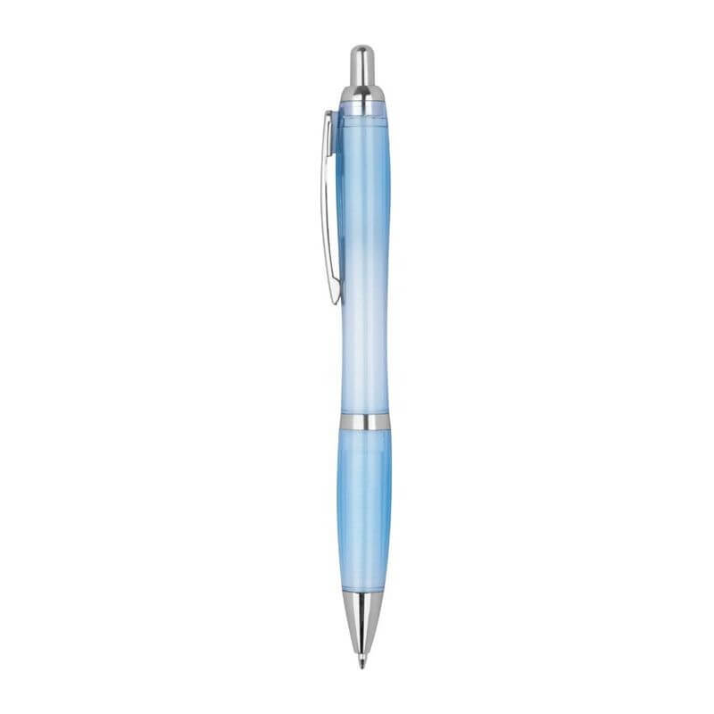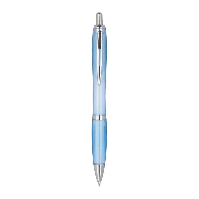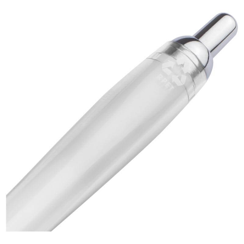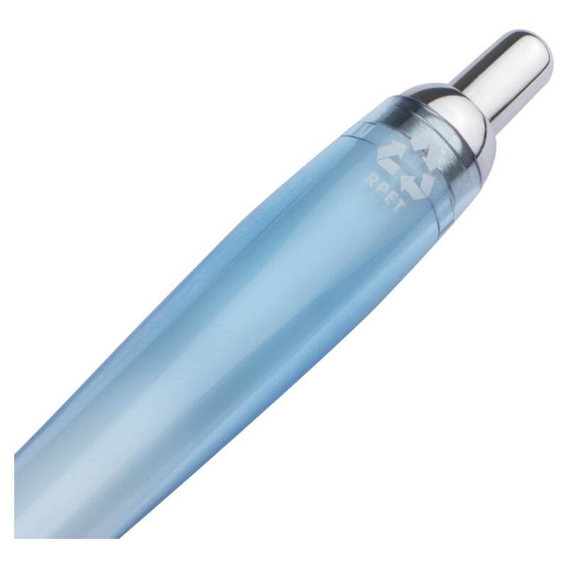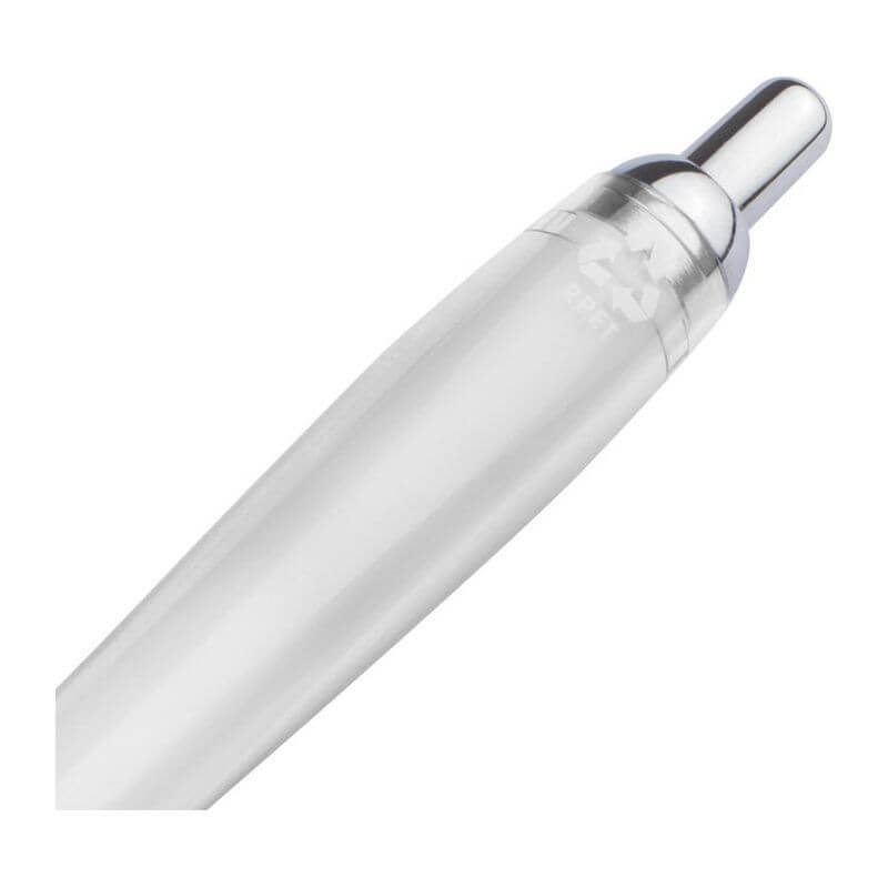 Klasické guľôčkové pero z recyklovaného PET, priehľadné so striebornými aplikáciami, gumovým puzdrom a veľkokapacitnou modrou náplňou.