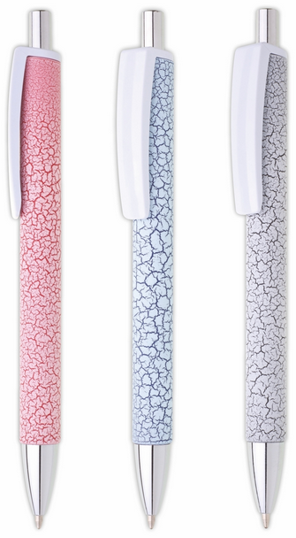 Plastové guľôčkové pero SINAY s efektom rozpraskaného povrchu. Každý kus je originál. Pochrómované doplnky a biely klip. Modrá náplň veľkoobjemová. Kolekcia DESIGN. Velkoobsahová