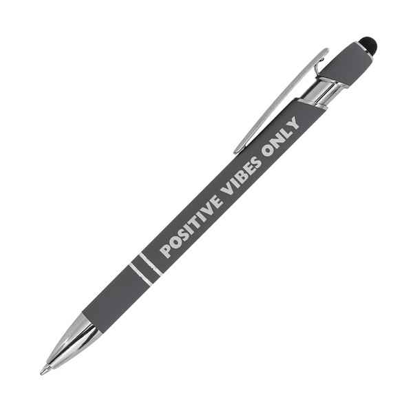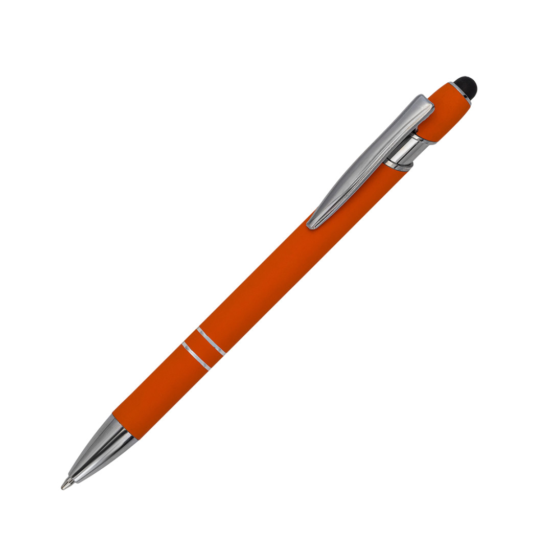 Hliníkové pero s pogumovaným saténovým povrchom príjemným na dotyk a modrou náplňou. Vybavené dotykovým perom (stylusom) a striebornými doplnkami.