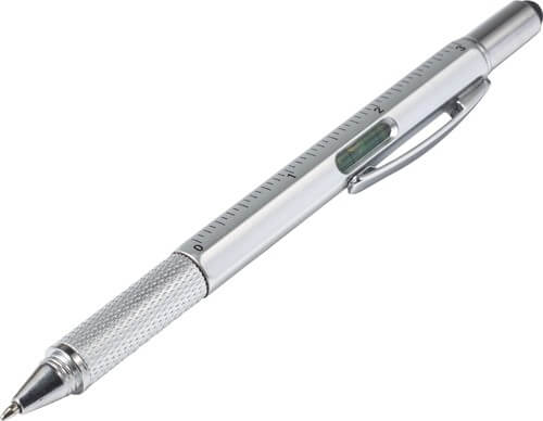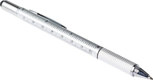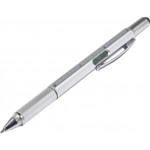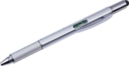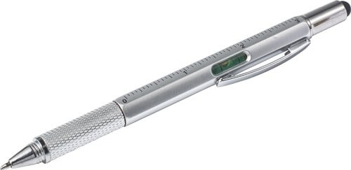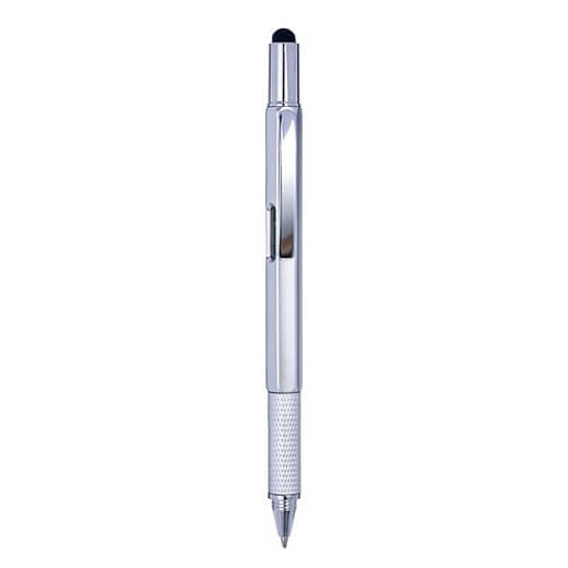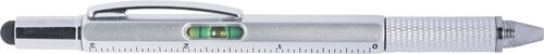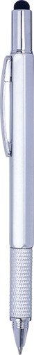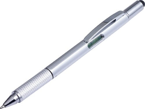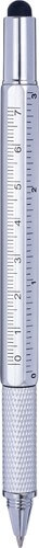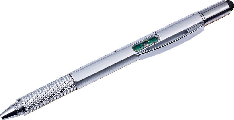 Multifunkčné plastové guľôčkové pero s krútiacim účinkom. Vybavený vodováhou a pravítkom na boku a gumovou špičkou pre kapacitné obrazovky. Čierny atrament.
