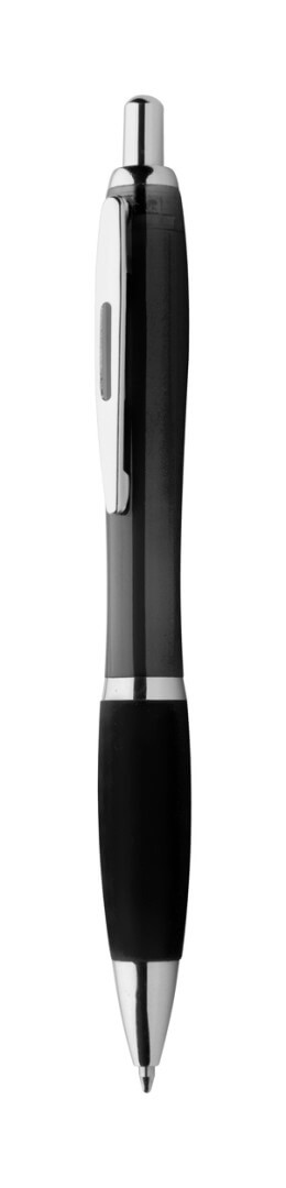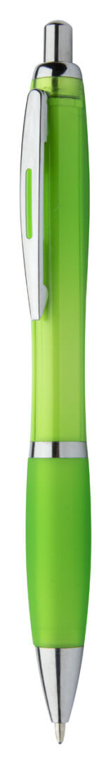 Plastové guličkové pero, farebné telo, gumový grip, lesklé chromované časti, modrá náplň.
