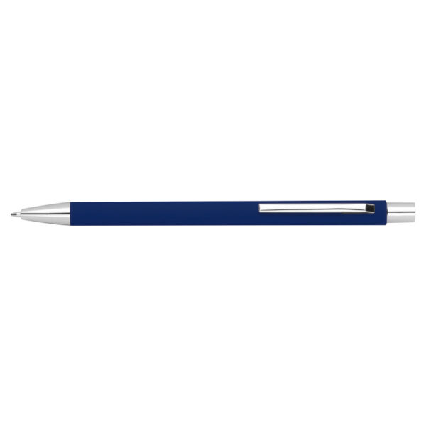 Tenké plastové stláčacie guľôčkové pero so striebornými aplikáciami a modrou náplňou.