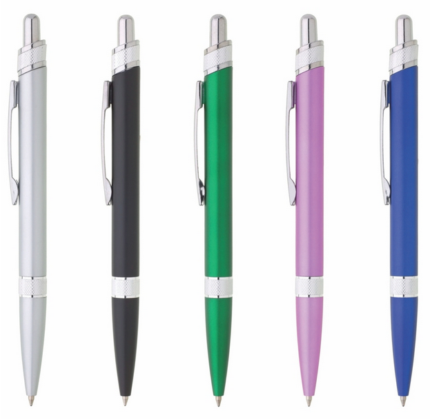 Plastové pero s metalickým strieborným povrchom a chrómovými ozdobnými detailmi. Veľkoobjemová, modro píšuca náplň. Velkoobsahová