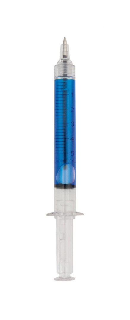 Guľôčkové pero v tvare injekčnej striekačky. Modrá tuha.