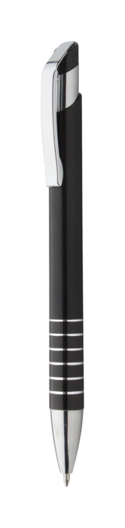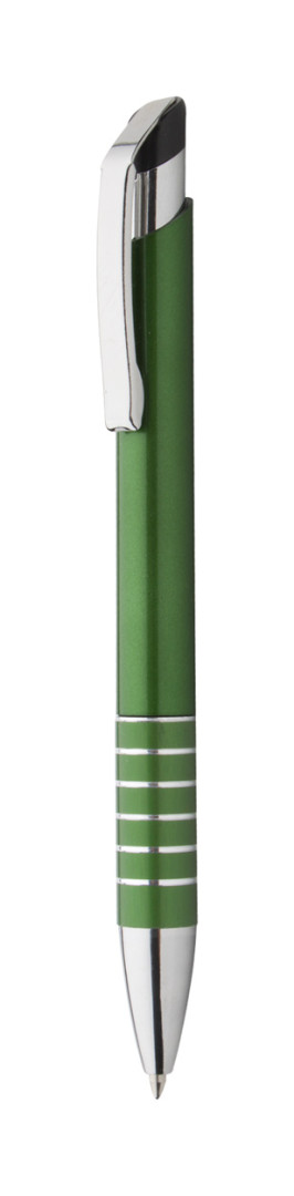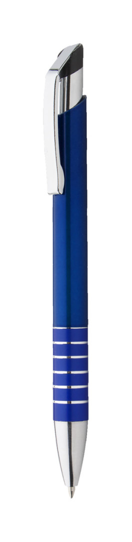 Plastové guličkové pero s kovovým hrotom, hliníkovou rukoväťou a kovovou sponou. Dodávané s modrou náplňou.
